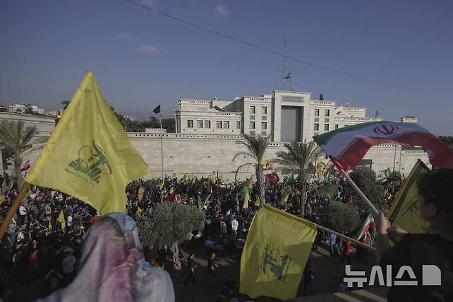 [베이루트=AP/뉴시스] 25일(현지 시간) 레바논 베이루트 주재 이란 대사관 밖에서 열린 이란 지지 집회 참석자들이 이란 국기와 헤즈볼라 깃발을 흔들고 있다. 집회 주최 측은 "미국과 이스라엘의 침략을 무너뜨린" 이란을 기리고 지지하기 위해 집회를 열었다고 밝혔다. 2025.06.26.