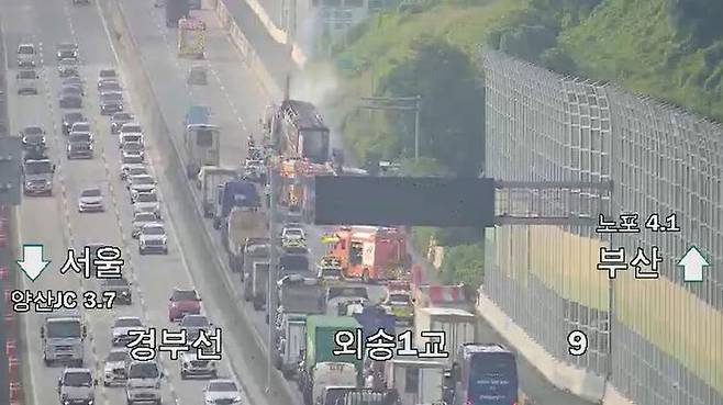 오늘(26일) 오전 5시 50분쯤 경남 양산시 경부고속도로 노포 방향을 달리던 화물차에서 불이 났습니다.