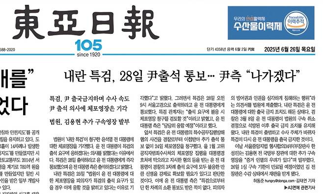 | ▲ 6월 26일 동아일보 1면 기사. |