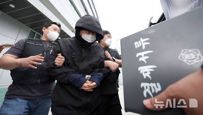 [서울=뉴시스] 김선웅 기자 = 초등학교 여학생에게 사진을 요구하고 거절당하자 살해하겠다며 인터넷에 협박글을 게시한 혐의로 구속된 20대 남성 A 씨가 26일 서울 중랑경찰서에서 검찰로 송치되고 있다. 2025.06.26. mangusta@newsis.com