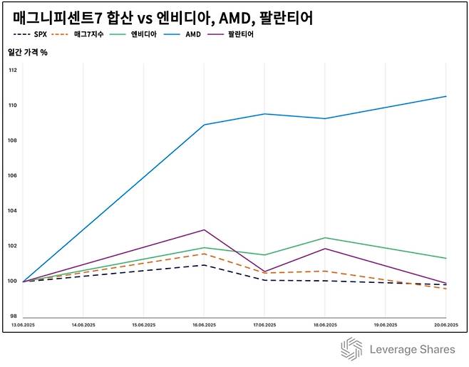 블룸버그 매그7 지수(BM7P)는 동등 비중의 7개 기술주로 구성된 지수로, 이번 주 보합권에 머물렀다. 국방 분야와 협력 중인 팔란티어도 유사한 흐름을 보였다. 예외적으로는 AMD가 있었다. AI 역량 강화에 따른 증권사 전망 상향으로 인해 주가가 급등했다. BM7P와 S&P 500의 움직임은 AMD의 상승이 구성 종목 간의 조정 효과였음을 시사한다.