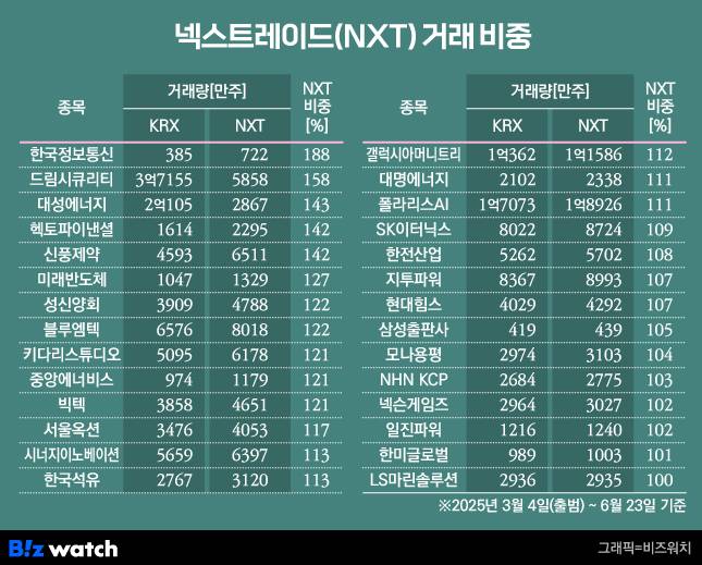대체거래소(ATS) 넥스트레이드(NXT)가 출범한 이후 3월 4일부터 지난 23일까지 전체 800개 중 407개 종목의 거래량이 '법률상 거래량 한도(한국거래소의 30%)'를 웃도는 것으로 확인됐다. 특히 한국정보통신의 넥스트레이드 거래 비중은 188%에 달하면서 한도를 6배 이상 초과했다.
