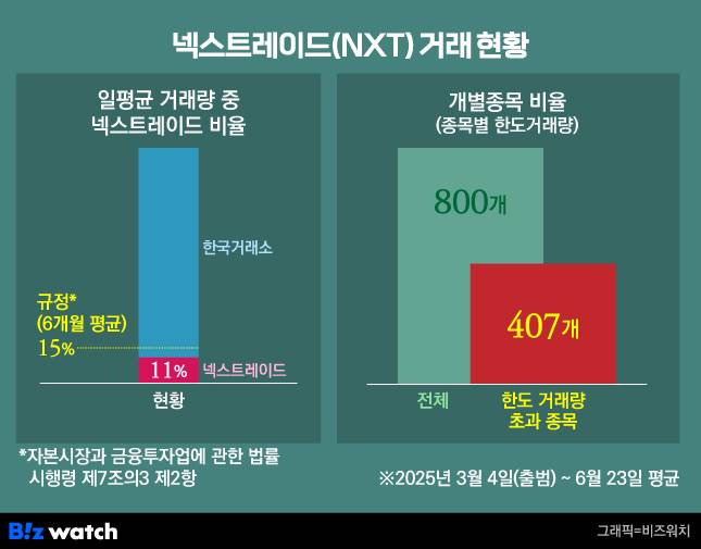 다만 넥스트레이드의 전체 일평균 거래량은 한국거래소 대비 11% 수준으로 아직 한도(15%)에 여유가 있는 상황이다.