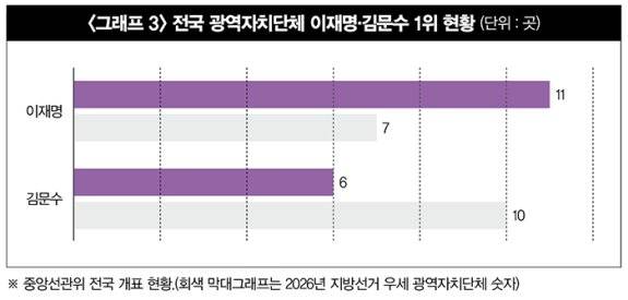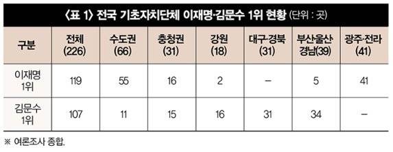 ● 전국 기초단체 1위 이재명 119곳·김문수 107곳