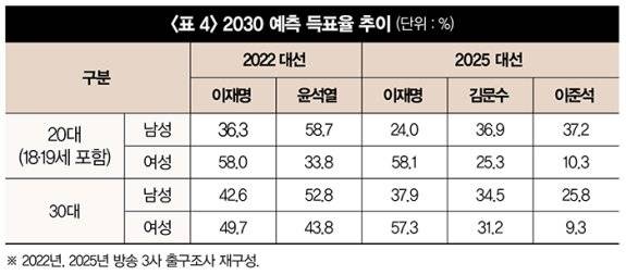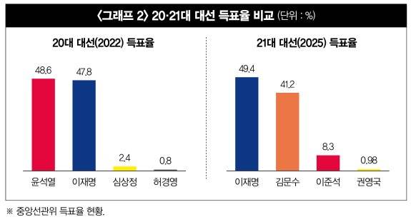 이번 대선의 특징 중 하나는 2030 보수화 현상을 꼽을 수 있다. 18∼19세를 포함한 2030 유권자 비중은 30.2%로 대략 1336만 명이다. 성별에 따른 2030의 선택이 눈에 띄게 달라지기 시작한 시기는 2022년 대선이 처음이다. 물론 그 이전에도 조금씩 변화가 진행됐다. 서울시장과 부산시장 등이 포함된 2021년 4월 재보궐선거에서 2030 남성은 국민의힘 후보에게 몰표를 던졌다. 결집은 종종 역결집을 부르곤 한다. 이것이 계기가 돼 2022년 대선에선 2030 여성도 민주당 후보 지지로 돌아섰다. 이번 대선에서도 남성은 국민의힘, 여성은 민주당 후보 쏠림 현상이 이어졌다.2022년 대선에서 20대 남성은 △국민의힘 윤석열 58.7% △민주당 이재명 36.3%로 나뉘었다. 20대 여성은 △윤석열 33.8% △이재명 58.0%로 정반대 행태를 보였다. 올해 대선에선 20대 남성의 보수 쏠림이 더욱 심화했다. 민주당 이 후보 선택은 24.0%로 지난 대선보다 12.3%포인트나 감소했다. 반면 보수 후보 선택은 △김문수 36.9% △이준석 37.2% 등 그 합이 74.1%나 됐다. 20대 여성의 이 후보, 보수 후보 선택 비중은 거의 차이가 없었다.