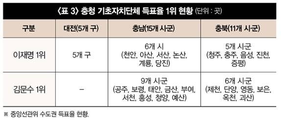 역대 대선 승패의 기준으로 평가되는 충청에서도 이 후보가 우세를 이어갔다. 대전 5개 구에서는 모두 1위였다. 지난해 4월 총선과 같은 흐름이었다. 충남 15개 시·군에서는 김 후보가 상대적으로 약진했다. 김 후보는 9개 시·군에서 1위에 올랐고, 이 후보는 천안·아산·서산·논산·계룡·당진 등 6곳에서 1위였다. 충북 기초자치단체 수에선 이 후보와 김 후보가 팽팽한 접전 양상을 보였다. 그러나 충북 인구의 3분의 2가 넘는 청주, 충주에선 이 후보가 1위를 지켰다. 이 밖에 음성, 진천, 증평 등 충북 북부 지역에서도 이 후보가 1위였다. 김 후보는 제천과 단양 이외에 충북 남부 4군에서 우세였다(표 3 참조).내년 지방선거에선 서울과 충청권이 최대 격전지로 떠오를 전망이다. 이 후보가 1위인 서울 21개 구에서 5%포인트 이내로 승부가 갈린 곳은 중구, 성동구, 영등포구, 강동구 4곳이었다. 또 국민의힘과 개혁신당이 선거 연대에 나설 경우 서울 대부분의 구에서 치열한 승부가 펼쳐질 수도 있다. 경우에 따라선 야권이 우세를 보일 가능성도 있다.