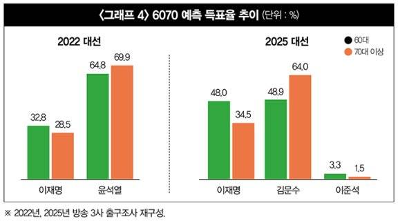 또 하나는 12·3 '계엄 사태'에 대한 비판적 태도다. 60대는 대부분 1979∼1980년 전후에 있었던 박정희 대통령 서거와 신군부에 의한 '계엄 사태'를 직간접적으로 경험했다. 이 때문에 60대 일부는 보수 성향이라고 하더라도 '계엄 사태'로부터 자유롭지 못한 김 후보 대신 이 후보를 선택했을 가능성이 있다. 60대의 진보화는 대선 전에 발표된 다수의 여론조사에서도 예고됐다. 정당 또는 대선 후보 지지율에서 보수와 진보가 대체로 균형을 이룬 경우가 많았다.