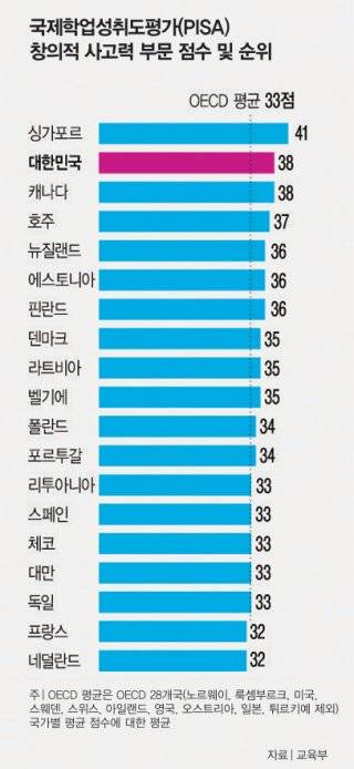 OECD는 창의적 사고력을 "독창적이고 효과적인 문제해결 방안, 지식의 발전, 영향력 있는 상상력의 표현으로 이어질 수 있는 아이디어 생성·평가·개선에 생산적으로 참여할 수 있는 역량"으로 정의한다. 한국은 이 평가에서 60점 만점에 평균 38점을 받아 싱가포르(41점)에 3점 뒤진 2위에 올랐다. 세계 64개국을 대상으로 한 평가 결과 캐나다가 우리와 같은 38점을 받았고 호주(37점), 뉴질랜드(36점) 등이 뒤를 이었다.