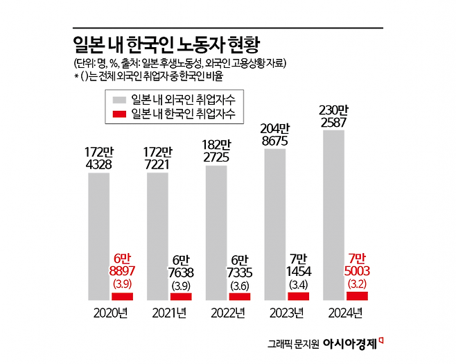 하지만 취업 의지는 실제 고용으로 이어지지 않고 있는 것으로 보인다. 지난해 기준 일본 내 우리 취업자 수는 7만5003명으로, 우리나라에서 취업한 일본인 숫자(9000명)의 8배 이상이었다. 10년 전인 2014년 1만1000명이었던 것과 비교하면 오히려 줄었다.