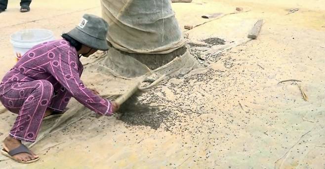 | ▲ 아자수로 만든 우리에서 밤새 박쥐들이 싼 배설물을 이튿날 모아 채로 고르는 크메르 여성. |
