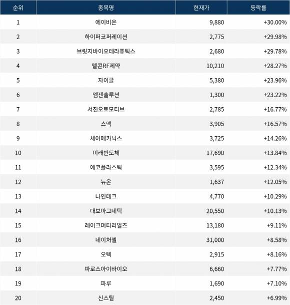 이어 상승률 2위 하이퍼코퍼레이션(065650)은 현재가 2,775원으로 주가가 29.98% 상한가를 기록하고 있다. 상승률 3위 브릿지바이오테라퓨틱스(288330)는 현재 2,680원으로 29.78% 폭등하고 있다. 상승률 4위 텔콘RF제약(200230)은 28.27% 폭등하며 10,210원에 거래되고 있다. 상승률 5위 자이글(234920)은 23.96%의 급등세를 타고 5,380원에 거래되고 있다.