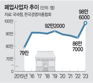 26일 국세청 국세통계포털에 따르면 지난 2023년 폐업한 사업자(법인·개인 포함)는 98만6000명을 기록했다. 비교 가능한 통계가 집계된 2006년 이후 사상 최대치다. 코로나19 사태가 정점을 찍었던 2021년(88만5000명)보다도 약 10만 명 많다. 업종별로는 ‘길거리 경기’로 불리는 소매업(27만7000명), 기타 서비스업(21만8000명), 음식업(15만8000명) 등의 순으로 폐업자가 많았다. 폐업률 기준으로는 음식업(16.2%), 소매업(15.9%) 등 소상공인이 많은 업종이 높게 나타났다. 또 매출 규모가 상대적으로 영세한 간이사업자의 폐업률(13.0%)이 일반사업자(8.7%)나 법인사업자(5.5%)보다 크게 높은 것으로 조사됐다. 지난해 폐업자는 100만 명을 넘어섰다는 암울한 관측도 나온다. 국회 기획재정위원회 소속 정일영 더불어민주당 의원이 국세청으로부터 제출받은 자료에 따르면 지난 2023년 월수입이 100만 원 미만인 개인사업자는 4년 만에 300만 명 넘게 늘어난 922만185명을 기록, 전체 개인사업자의 약 75.7%를 차지했다.