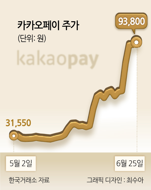 26일 한국거래소에 따르면 카카오페이 주가는 지난 한 달간 209.57% 급등하며 유가증권시장 상승률 1위를 기록했다. 지난달 23일 3만300원이던 주가는 이재명 정부의 ‘AI 수혜주’로 분류되며 급등했고, 20일에는 스테이블코인 관련 상표권 출원 소식에 상한가를 기록했다.