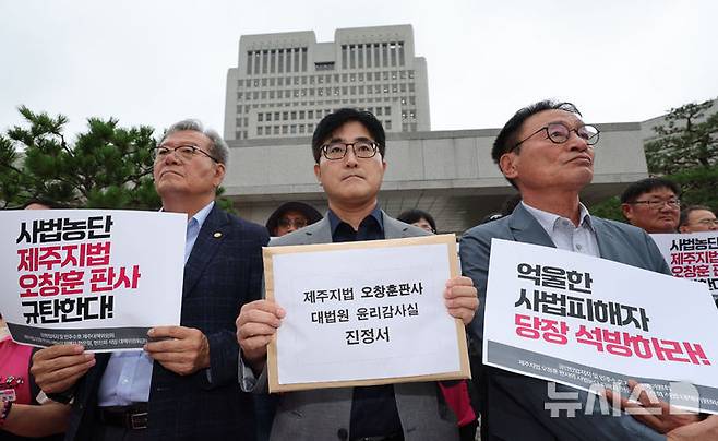 [서울=뉴시스] 권창회 기자 = 공안탄압저지 및 민주수호 제주대책위원회를 미롯한 시민단체 회원들이 26일 오전 서울 서초구 대법원 앞에서 열린 제주지법 오창훈 판사의 불법재판으로 구속된 현은정-현진희 항고심 파기환송 촉구 기자회견에서 진정서를 들고 있다. 2025.06.26. kch0523@newsis.com