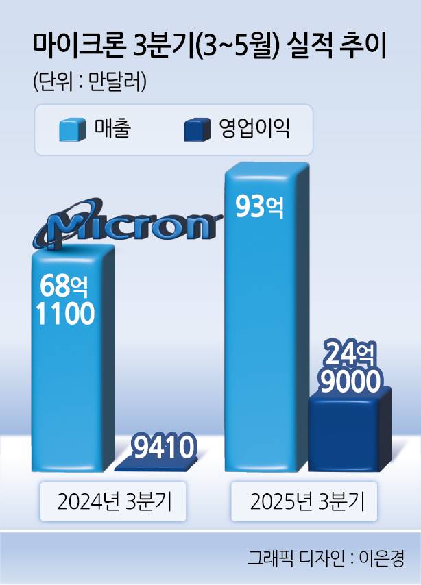 25일(현지시간) 마이크론은 회계연도 기준 3분기(3~5월) 매출이 93억달러(12조6600억원)을 기록했다고 밝혔다. 이는 분기 기준 역대 최대 규모이자 전년 동기 대비 37% 증가한 수치며, 시장의 예상치(88억5000만달러)도 훌쩍 넘겼다. 영업이익도 같은 기간 165% 급증, 24억9000만달러(약 3조3900억원)를 기록했다. 지난 3월 엔비디아에 12단 HBM3E를 대량 공급한 것이 이번 호실적을 견인한 것으로 보인다.
