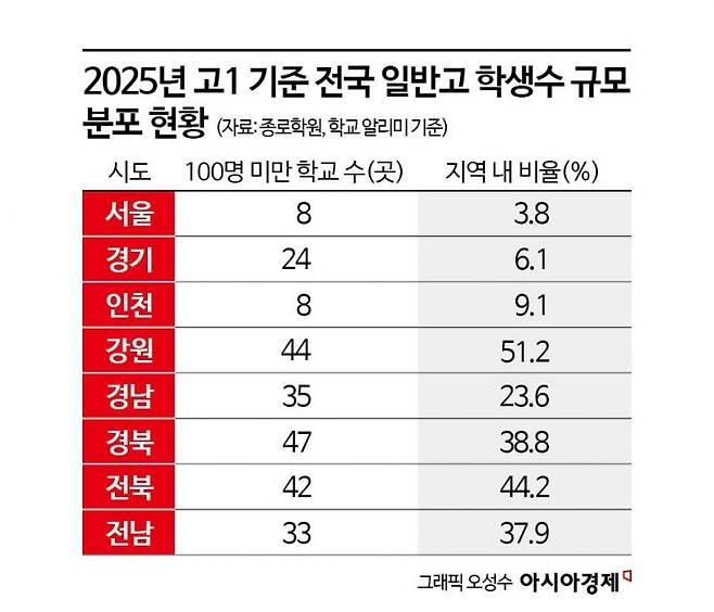 지역 내 100명 미만 학교 비중을 보면 서울(3.8%, 213개 고교 중 8곳), 경기(6.1%, 396개 고교 중 24곳), 인천(9.1%, 88개 고교 중 8곳) 등에선 한 자릿수였다.