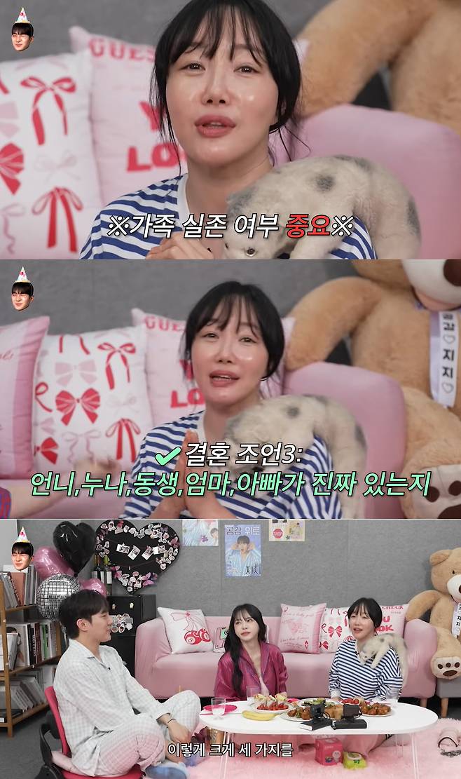 이어 "무슨 서류들을 다 떼야한다. 빚이 얼만큼 있는지 다 얘기하겠지만 그게 사실인지 확인하고 가족들 실제로 있는지 가족 실존 여부가 중요하다. 언니, 누나, 동생, 엄마, 아빠가 진짜 맞는지. 이렇게 크게 세 가지를 정확하게 확인해보고 결혼을 하면 좋겠다. 힘든 것을 겪었던 왕언니 왕누나로서 조언한다"고 전했다.
