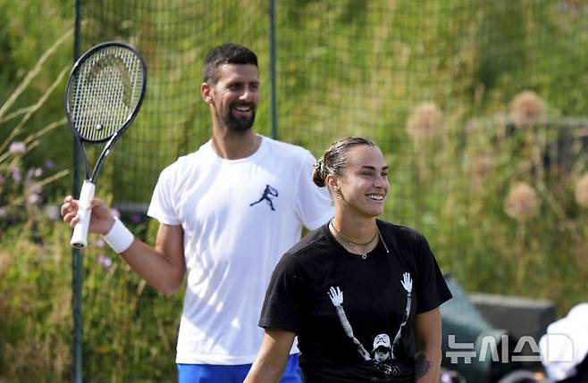 [런던=AP/뉴시스] 노바크 조코비치(6위·세르비아)와 아리나 사발렌카(1위·벨라루스)가 25일(현지 시간) 영국 런던의 올잉글랜드 론 테니스&크로케 클럽에서 2025 윔블던을 앞두고 즐겁게 훈련하고 있다. 2025 윔블던은 6월 30일부터 7월 13일까지 열린다. 2025.06.26.