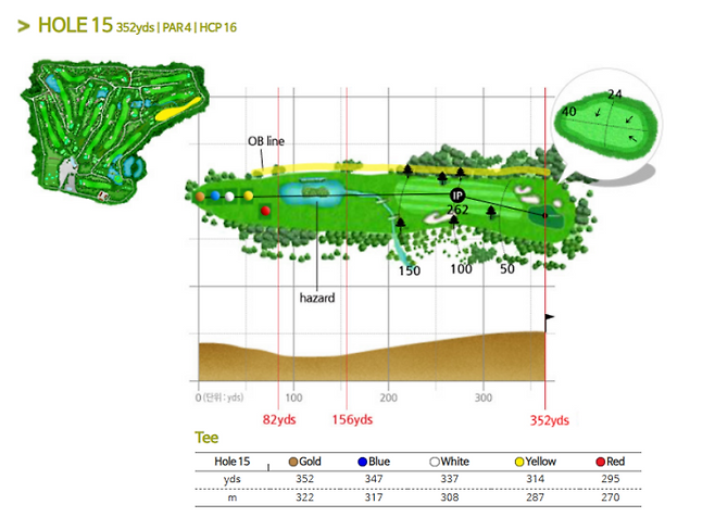권 이사장은 고령자가 사용하는 옐로우 티를 썼을 겁니다. 이글을 사냥한 15번 홀의 경우 가장 긴 골드 티는 352야드이고, 옐로우 티는 314야드, 가장 짧은 레드 티는 295야드로 돼 있습니다.