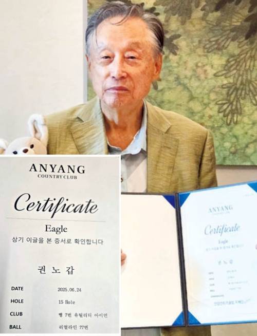 고 김대중 전 대통령의 측근이자 동교동계의 좌장인 권 이사장은 24일 경기 군포시에 자리한 삼성그룹 계열의 명문 골프장 안양CC(파72) 15번 홀(파4)에서 초고반발 클럽으로 유명한 뱅골프의 7번 유틸리티 아이언으로 한 두 번째 샷이 컵에 빨려 들어가 단번에 2타를 줄였습니다. 권 이사장은 안양CC에서 이글을 기념하기 위해 발급한 인증서를 받아 들고 감개무량한 표정을 지었습니다. 이글에 사용한 공은 리얼라인 77번이었다고 합니다. 사용 클럽과 골프공에 모두 ‘7’자가 들어가 있는 걸 보면 ‘러키세븐’이라는 말이 떠오르게 합니다.