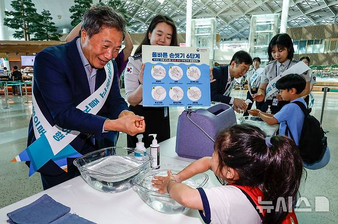[서울=뉴시스] 김선웅 기자 = 이학재(왼쪽) 인천국제공항공사 사장과 윤현덕(왼쪽 세 번째) 국립인천공항검역소 소장이 26일 인천국제공항 제2여객터미널 출국장에서 열린 '여름 휴가철 맞이 안전여행 캠페인'에서 여행객들에게 올바른 손 씻기를 알리고 있다. (공동취재) 2025.06.26. photo@newsis.com