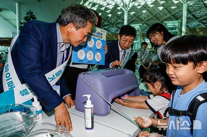 [서울=뉴시스] 김선웅 기자 = 이학재(왼쪽) 인천국제공항공사 사장과 윤현덕(왼쪽 두 번째) 국립인천공항검역소 소장이 26일 인천국제공항 제2여객터미널 출국장에서 열린 '여름 휴가철 맞이 안전여행 캠페인'에서 여행객들에게 올바른 손 씻기를 알리고 있다. (공동취재) 2025.06.26. photo@newsis.com