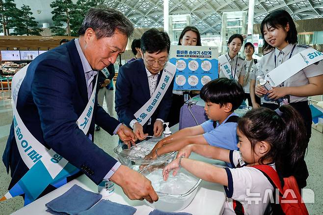 [서울=뉴시스] 김선웅 기자 = 이학재(왼쪽) 인천국제공항공사 사장과 윤현덕(왼쪽 두 번째) 국립인천공항검역소 소장이 26일 인천국제공항 제2여객터미널 출국장에서 열린 '여름 휴가철 맞이 안전여행 캠페인'에서 여행객들에게 올바른 손 씻기를 알리고 있다. (공동취재) 2025.06.26. photo@newsis.com
