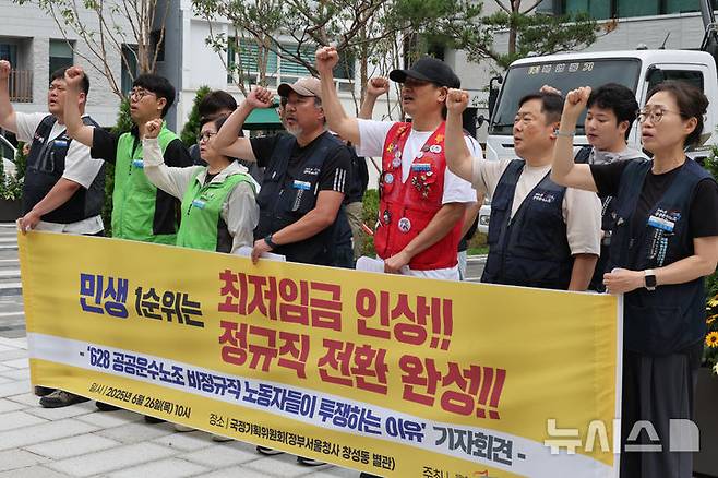 [서울=뉴시스] 김명원 기자 = 민주노총 공공운수노조가 26일 오전 서울 종로구 국가기획위원회 앞에서 열린 민생 1순위는 최저임금 인상! 정규직 전환 완성! 등 6.28 총력투쟁 선포 기자회견에서 구호를 외치고 있다. 2025.06.26. kmx1105@newsis.com