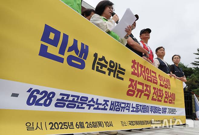 [서울=뉴시스] 김명원 기자 = 민주노총 공공운수노조가 26일 오전 서울 종로구 국가기획위원회 앞에서 민생 1순위는 최저임금 인상! 정규직 전환 완성! 등 6.28 총력투쟁 선포 기자회견을 하고 있다. 2025.06.26. kmx1105@newsis.com
