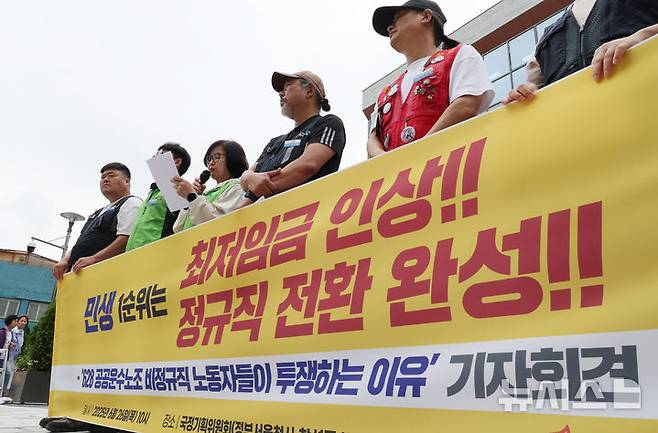 [서울=뉴시스] 김명원 기자 = 민주노총 공공운수노조가 26일 오전 서울 종로구 국가기획위원회 앞에서 민생 1순위는 최저임금 인상! 정규직 전환 완성! 등 6.28 총력투쟁 선포 기자회견을 하고 있다. 2025.06.26. kmx1105@newsis.com