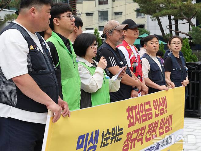 [서울=뉴시스] 김명원 기자 = 민주노총 공공운수노조가 26일 오전 서울 종로구 국가기획위원회 앞에서 민생 1순위는 최저임금 인상! 정규직 전환 완성! 등 6.28 총력투쟁 선포 기자회견을 하고 있다. 2025.06.26. kmx1105@newsis.com