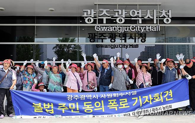 (광주=연합뉴스) 정다움 기자 = 26일 오전 광주 서구 광주시청 앞에서 삼도소각장반대 대책위원회가 '광주 자원 회수센터 불법 주민 동의 폭로 기자회견'을 열고 구호를 외치고 있다. 2025.6.26