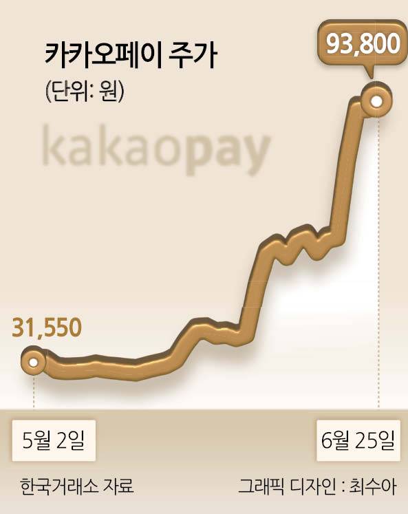 26일 한국거래소에 따르면 카카오페이 주가는 지난 한 달간 209.57% 급등하며 유가증권시장 상승률 1위를 기록했다. 지난달 23일 3만300원이던 주가는 이재명 정부의 ‘AI 수혜주’로 분류되며 급등했고, 20일에는 스테이블코인 관련 상표권 출원 소식에 상한가를 기록했다.