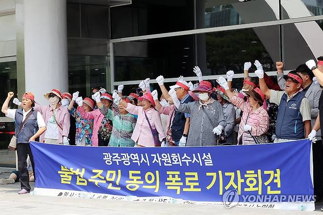 (광주=연합뉴스) 정다움 기자 = 26일 오전 광주 서구 광주시청 앞에서 삼도소각장반대 대책위원회가 '광주 자원 회수센터 불법 주민 동의 폭로 기자회견'을 열고 구호를 외치고 있다. 2025.6.26