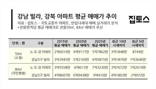 부동산 중개업체 집토스는 국토교통부 실거래가 자료를 바탕으로 서울 강남3구(강남·서초·송파)와 노도강(노원·강북·도봉) 집값을 비교한 결과 2020년부터 올해(25일 기준)까지 약 5년 간 강남3구 연립·다세대 주택(이하 빌라)의 평균 상승률이 25.8%로, 노도강 아파트의 상승률(19.7%)을 넘었다고 26일 밝혔다.