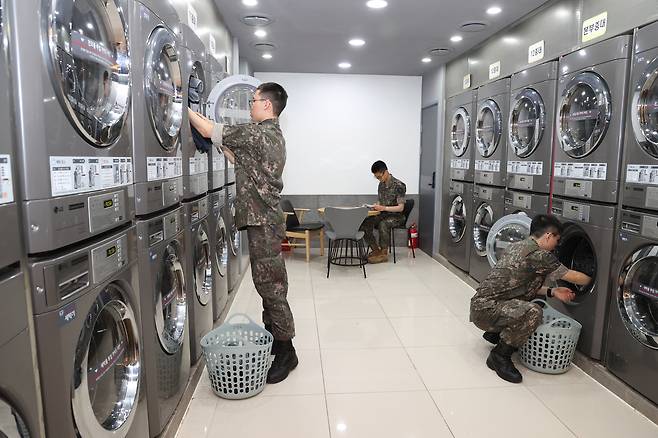 병영세탁방에서는 마치 대형 빨래방을 연상시키듯 전투복과 속옷 등을 가득 담은 세탁기와 건조기가 쉴 새 없이 돌아가고 있었다.