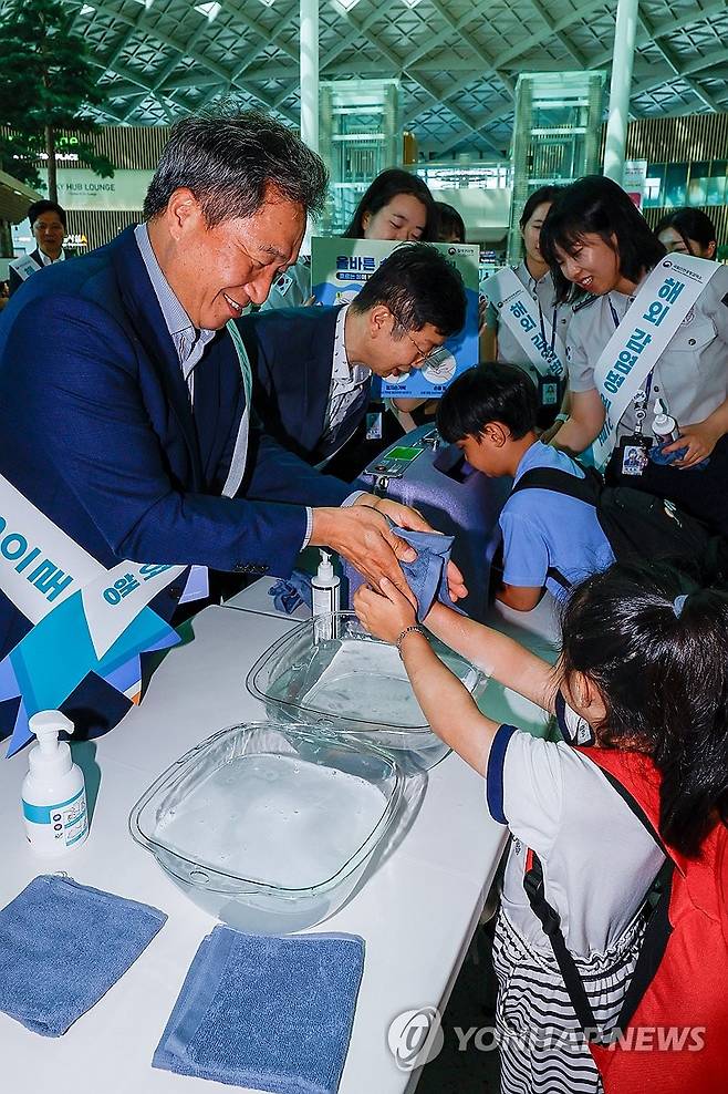 (영종도=연합뉴스) 이진욱 기자 = 이학재 인천국제공항공사 사장(왼쪽)이 26일 인천국제공항 제2여객터미널 출국장에서 열린 여름 휴가철 안전여행 캠페인에서 여행객들에게 올바른 손 씻기를 알리고 있다. 2025.6.26 [공동취재]