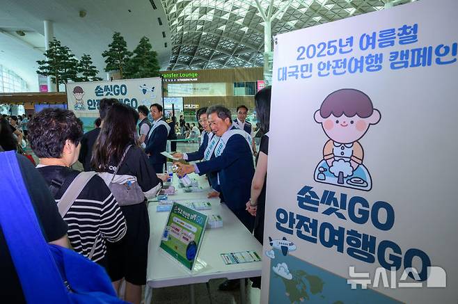 [인천공항=뉴시스] 김선웅 기자 = 이학재 인천국제공항공사 사장과 윤현덕 국립인천공항검역소 소장이 26일 인천국제공항 제2여객터미널 출국장에서 열린 '여름 휴가철 맞이 안전여행 캠페인'에 참석해 여행객들에게 올바른 손 씻기 방법을 소개하고 있다. (공동취재) 2025.06.26. photo@newsis.com