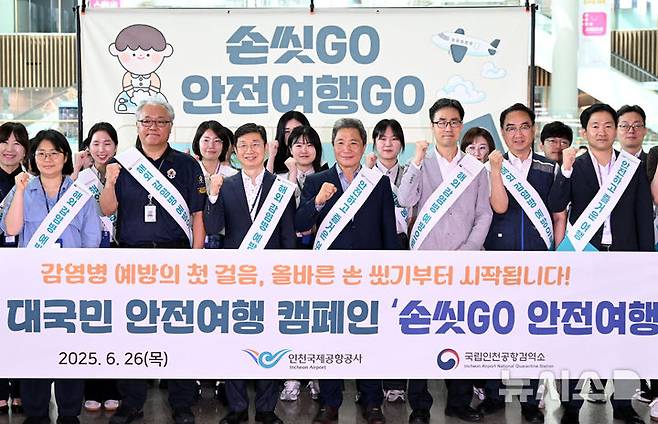 [인천공항=뉴시스] 김선웅 기자 = 이학재(오른쪽 네 번째부터) 인천국제공항공사 사장과 윤현덕 국립인천공항검역소 소장이 26일 인천국제공항 제2여객터미널 출국장에서 열린 '여름 휴가철 맞이 안전여행 캠페인'에 참석해 여행객들에게 올바른 손 씻기 방법을 홍보하고 있다. (공동취재) 2025.06.26. photo@newsis.com