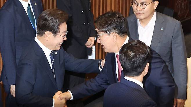 ▲ 이재명 대통령이 26일 추가경정예산 시정연설을 마친 뒤 국회 본회의장에서 국민의힘 권성동 의원과 인사하고 있다.