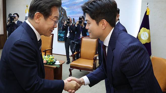 ▲ 이재명 대통령과 국민의힘 김용태 비상대책위원장이 26일 국회 접견실에서 추가경정예산 시정연설에 앞서 인사하고 있다.