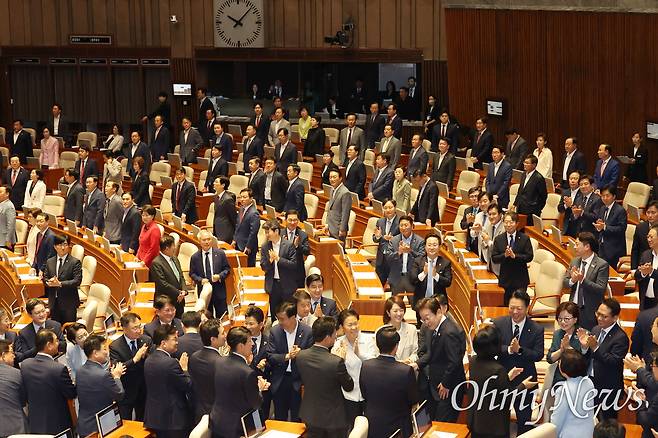 | ▲ 이재명 대통령이 26일 서울 여의도 국회 본회의에서 2025년도 제2회 추가경정예산안에 대한 시정연설을 위해 회의장에 입장하고 있다. 더불어민주당 의원들은 박수를 치며 이 대통령을 맞이하고 국민의힘 의원들은 굳은 표정으로 자리에 서있다. |