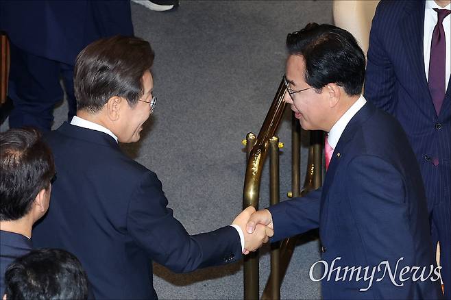 | ▲ 이재명 대통령이 26일 오전 서울 여의도 국회 본회의장에서 추가경정예산안(추경안) 시정연설을 마친 뒤 야당인 송언석 국민의힘 원내대표 등과 인사를 나누고 있다. |
