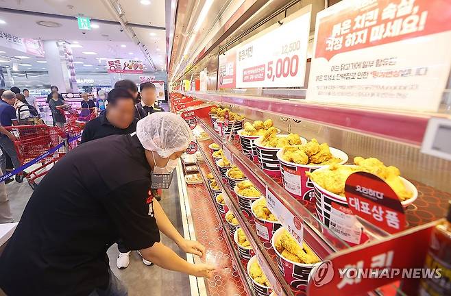 (서울=연합뉴스) 진연수 기자 = 롯데마트가 다음달 9일까지 2주간 '통큰 세일'을 진행한다고 밝혔다. 특히 '통큰치킨' 한 마리를 행사카드로 결제하면 2010년과 같은 가격인 5천원에 제공한다. 사진은 26일 서울 중구 롯데마트 제타플렉스 서울역점에서 통큰치킨을 구매하는 시민들. 2025.6.26