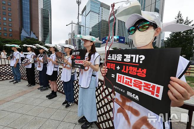 [서울=뉴시스] 배훈식 기자 = 동물권 NGO 동물해방물결 활동가 등이 26일 오전 서울 종로구 보신각 앞에서 소싸움 폐지 촉구 시민행동 퍼포먼스를 하고 있다. 2025.06.26. dahora83@newsis.com
