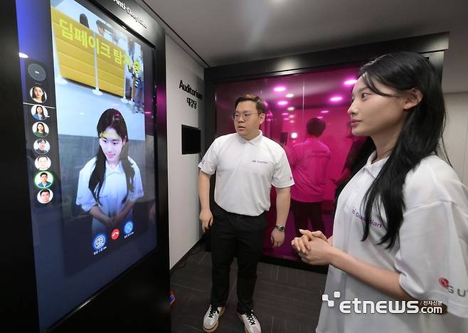 LG유플러스가 안티딥보이스 기술을 인공지능(AI) 통화 에이전트 서비스인 '익시오'에 탑재해 상용화한다. 26일 서울 중구 LG서울역빌딩에서 열린 LG유플러스 보안 기술 설명회에서 관계자가 영상의 딥페이크 합성 여부를 파악할 수 있는 '안티딥페이크' 기술을 시연하고 있다.