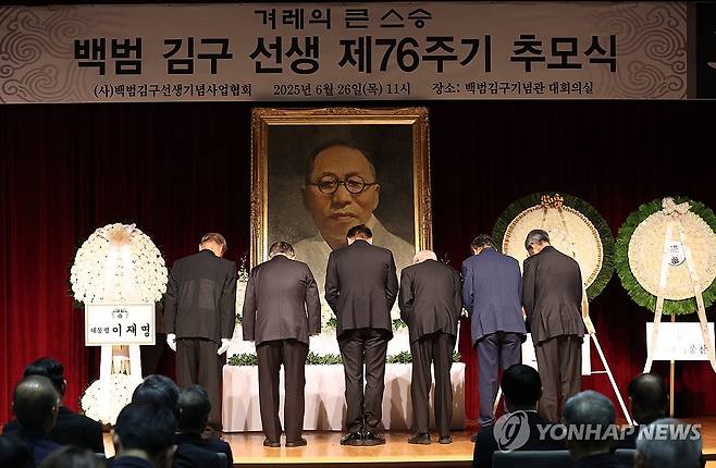 (서울=연합뉴스) 서명곤 기자 = 26일 서울 용산구 백범김구기념관에서 열린 백범 김구 선생 제76주기 추모식에서 참석자들이 헌화한 뒤 묵념하고 있다. 2025.6.26