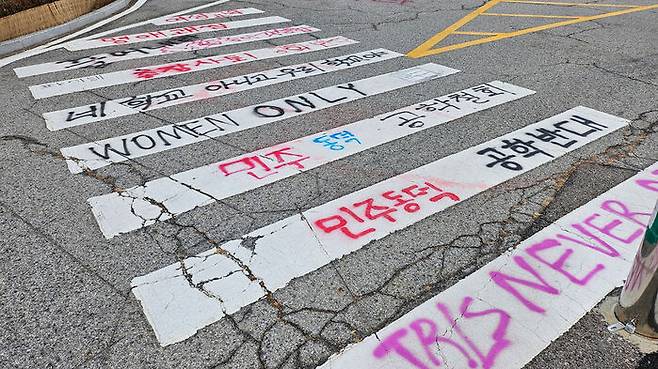 ▲ 지난 16일 동덕여자대학교 캠퍼스 내 횡단보도에 래커칠이 돼 있다.