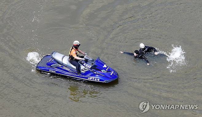 (대구=연합뉴스) 윤관식 기자 = 26일 대구 달성군 구지면 낙동강레포츠밸리 인근 낙동강에서 달성소방서 구조대원들이 풍수해 대비 인명구조 훈련을 하고 있다. 2025.6.26