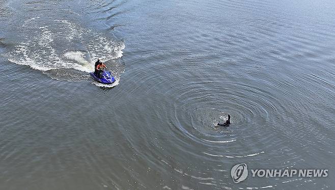 (대구=연합뉴스) 윤관식 기자 = 26일 대구 달성군 구지면 낙동강레포츠밸리 인근 낙동강에서 달성소방서 구조대원들이 풍수해 대비 인명구조 훈련을 하고 있다. 2025.6.26